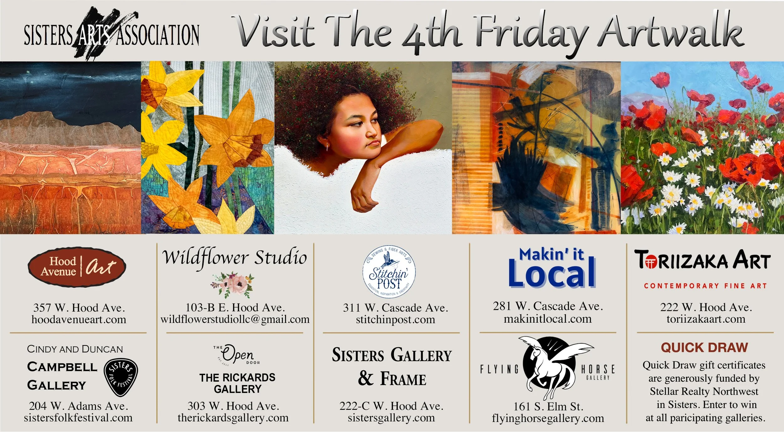 QuickDraw: At the close of the Artwalk, a drawing will b held for two $50 gift certificates, good at any participating gallery. Visitors may sign up once per gallery. Winners will be notified by phone and email, so it is important that all fields be complete. Thanks to Stellar Realty Northwest of Sisters for their generous sponsorship