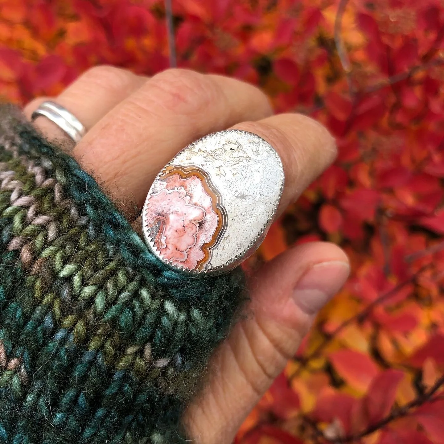 “My goal with my art is to convey a fusing of two places: Southwestern modern design and Pacific Northwest ruggedness. I have loved leather since I was young (making myself my own purses and footwear) and, when I couldn’t find any leather and mixed metal jewelry, I decided to make them myself.