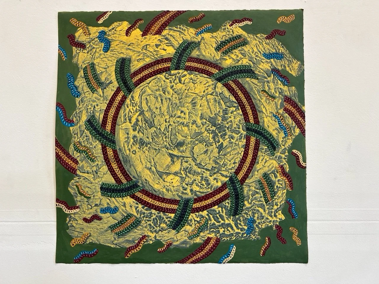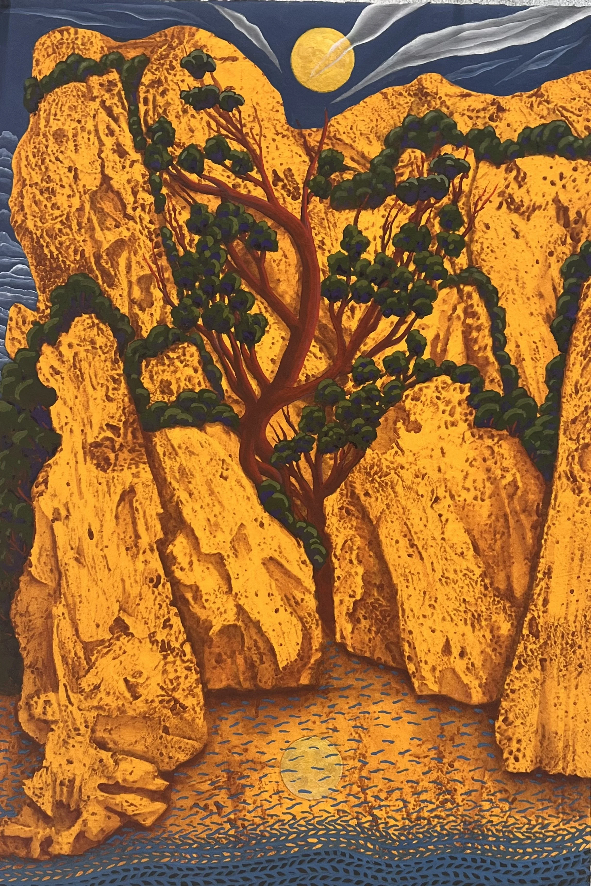 Paul's work has a certain style that looks like knitting in paint. This evolved from purchasing a pair of knitted gloves in Istanbul. He was attracted to the simple patterns and the texture of the gloves, so he decided to see if he could copy the “knit” look in paint. He used gouache watercolor as it is easy to change and is a logical extension of drawing but in paint. The “knit” look gradually became his signature style. At one point, Pendleton Woolen Mills was attracted to his work and created 16 tapestries in wool based on his designs.